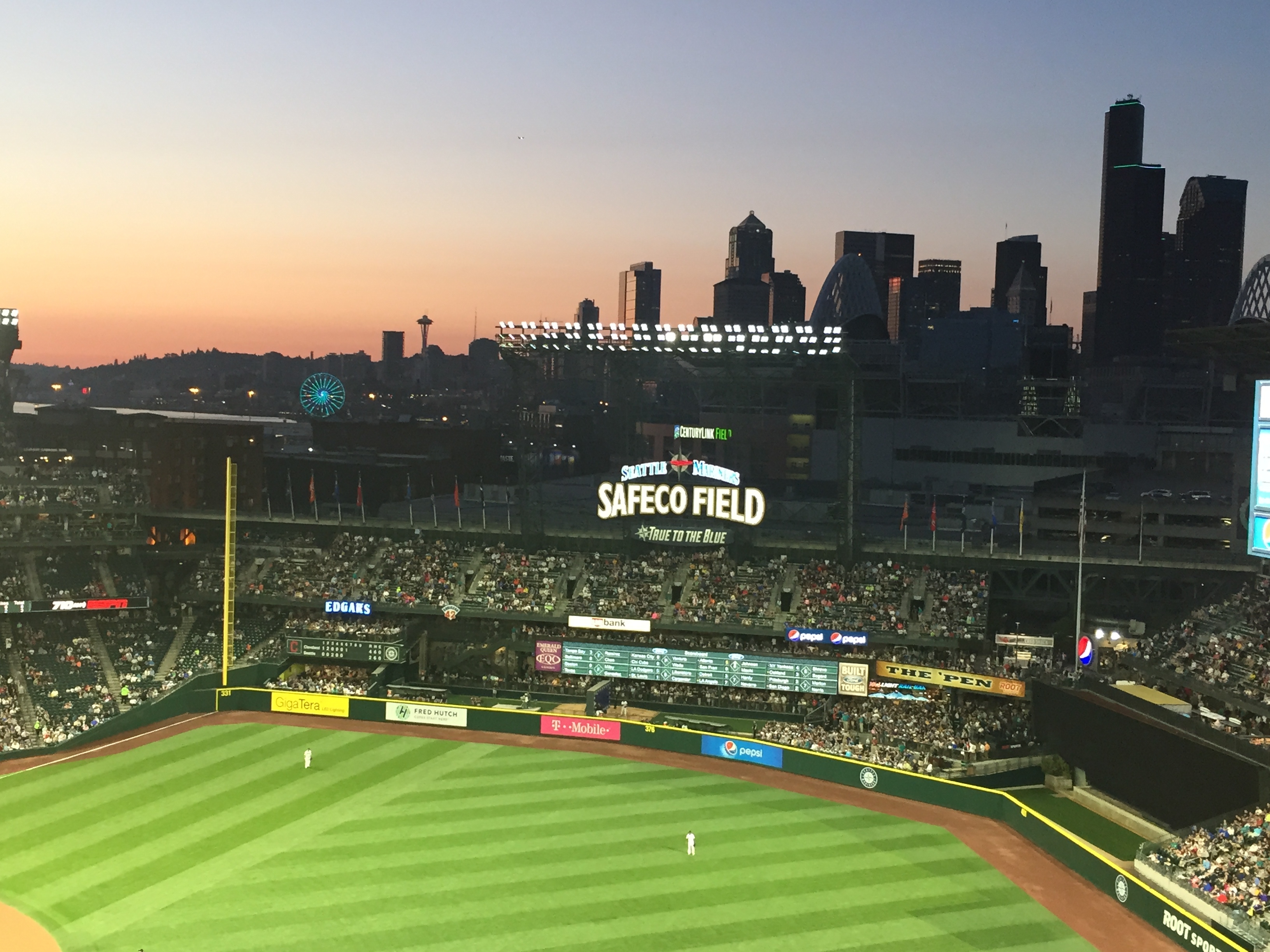 We had finished our tour and made our way to the seats where a ticket usher greeted us and checked our tickets. She laughed and pointed upward, “You’re in the penthouse” she snickered, “the very last row.” She wasn’t lying, we were literally in the last row of seats in the entire ballpark. As we marched up the seemingly endless rows of stairs, we were sure these seats would be awful. They turned out to be the show-stealer. Any seats in the upper deck down the 1B/RF line feature any absolutely gorgeous view of downtown Seattle. The Sound and its Ferris wheel, the skyline, and neighboring CenturyLink proved to be a breathtaking background for baseball.